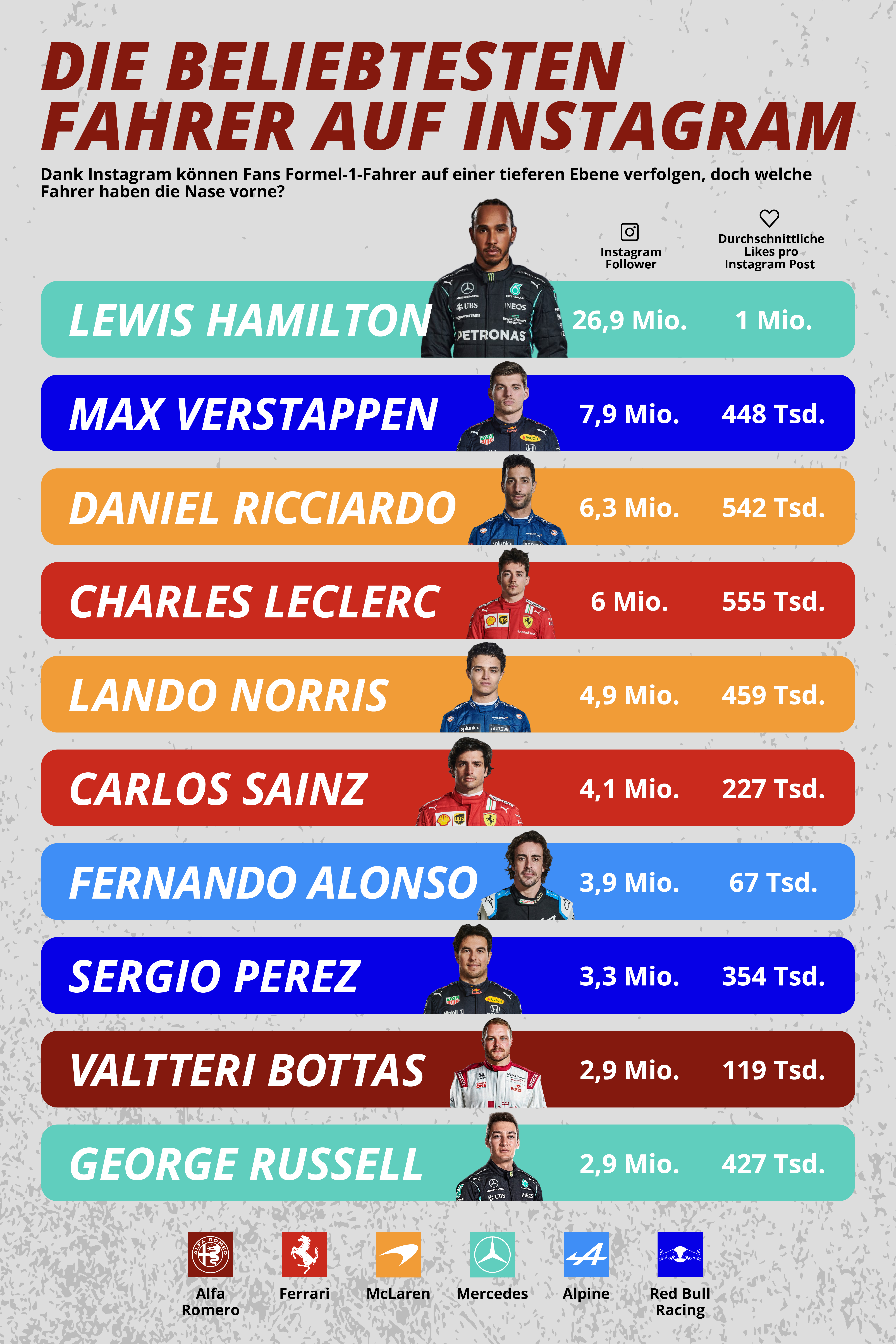 Wenig überraschend ist der siebenfache Weltmeister Lewis Hamilton mit fast 27 Millionen Instagram-Followern und durchschnittlich eine Million Likes pro veröffentlichtes Foto der Formel-1-Fahrer mit den meisten Followern. Max Verstappen, Sieger der Saison 2021, landet mit fast acht Millionen Followern auf dem zweiten Platz. McLaren-Fahrer Daniel Ricciardo liegt mit 6,3 Millionen Instagram-Followern und über 500.000 Likes pro Post (der dritthöchste Wert im Vergleich) an dritter Stelle. Der Australier hat mit seiner positiven Einstellung und seinem strahlenden Lächeln die Herzen vieler Fans erobert – es ist also nicht überraschend, dass er es unter die Top drei schafft.
