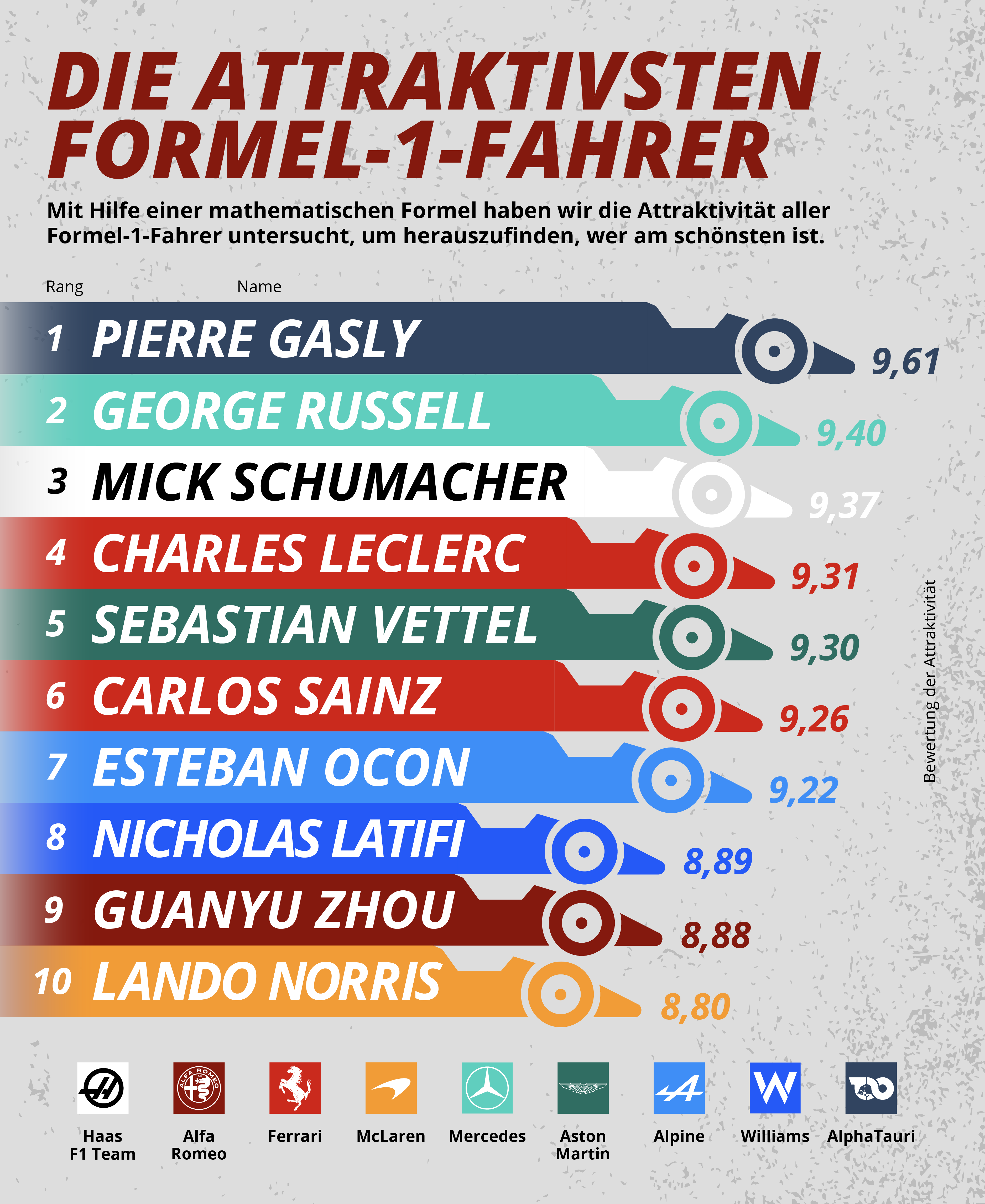 Auch die beiden deutschen F1-Fahrer schaffen es auf die Liste der Piloten mit den attraktivsten Gesichtern. Mick Schumacher, Sohn des siebenfachen Weltmeisters Michael Schumacher, belegt den dritten (9,37) und vierfacher Weltmeister Sebastian Vettel den fünften Platz (9,30).